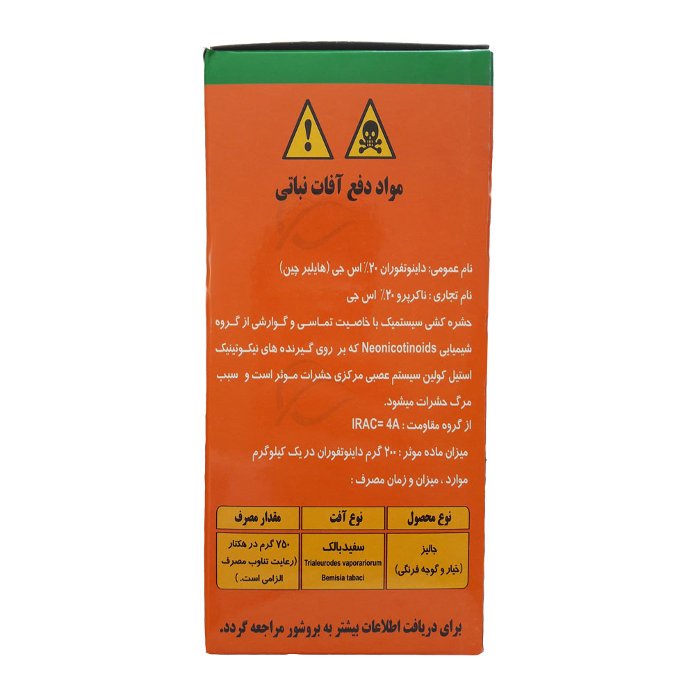 • موثر بر روی برخی آفات مقاوم به سموم ارگانوفسفره, کارباماتها و ترکیبات پایروتیروئیدی
